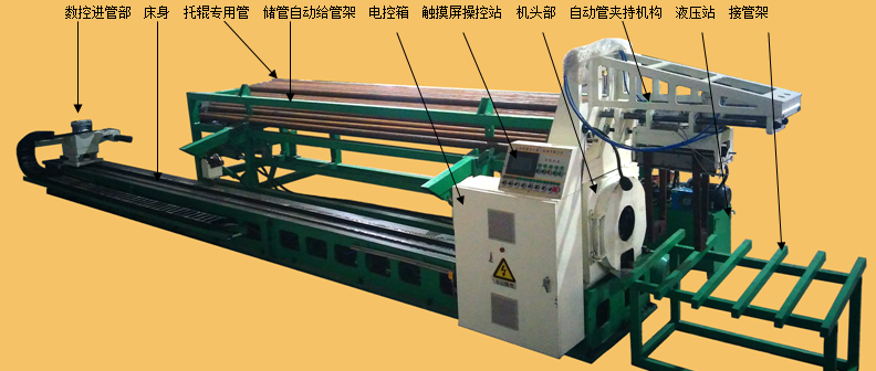 采用數(shù)控技術(shù)、PLC編程技術(shù),觸摸屏設(shè)定數(shù)值。精度高、自動(dòng)化程度高。儲(chǔ)管架自動(dòng)給管,數(shù)控進(jìn)管部自動(dòng)接管、內(nèi)漲緊夾持,按設(shè)定數(shù)值及設(shè)定程序自動(dòng)進(jìn)給。機(jī)頭部自動(dòng)完成夾緊和刀具切割,自動(dòng)管夾持機(jī)構(gòu)夾持管子。若一根管子切割完畢,數(shù)控進(jìn)管部自動(dòng)返回尾部,進(jìn)入下個(gè)循環(huán)。