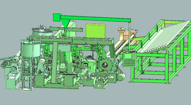 托輥輥皮加工中心是由:儲(chǔ)管架、切斷部件、雙端面成型刀鏜孔部件、吹屑部件、焊接部件、輥皮校圓部件、三點(diǎn)式機(jī)械手部件、電氣部件、氣動(dòng)部件、液壓部件,共十大部件組合而成。將目前托輥輥皮加工的三個(gè)獨(dú)立工序及設(shè)備集約為一個(gè)中心,實(shí)現(xiàn)了上料和輥皮流轉(zhuǎn)環(huán)節(jié)的自動(dòng)化,完成了切管、鏜孔、把軸承座旋壓(焊接)到管體、輥皮校圓除銹。輥皮的生產(chǎn)周期≤1分鐘,班產(chǎn)能≧500支。操作人員由原來的3人以上,減少到了1人,由半機(jī)械化實(shí)現(xiàn)了四工位自動(dòng)聯(lián)動(dòng)加工,降低了人工費(fèi)用,提高了生產(chǎn)效率。更主要的優(yōu)點(diǎn)是把產(chǎn)品的質(zhì)量控制,由操作人員的技能掌控,轉(zhuǎn)化成了由設(shè)備及程序來保障,提高了產(chǎn)品的優(yōu)質(zhì)率,增加了輥皮除銹校圓環(huán)節(jié),使托輥圓徑向跳動(dòng)量降到了0.15,比國(guó)家標(biāo)準(zhǔn)提高了3-5倍。主要技術(shù)特點(diǎn):1.3工位4點(diǎn)式平移機(jī)械手。2.輥皮鏜孔采用多刃式成型鏜孔刀(專利)。3.多刀式輥皮除銹校圓加工工藝(專利)。4.下料、鏜支口及旋壓均采用數(shù)控控制技術(shù),加工精度為±0.06。5.鏜止口和旋壓均采用自動(dòng)三爪夾緊定位,比傳統(tǒng)V型鐵定位夾緊,降低了圓徑向跳動(dòng)量(專利)。